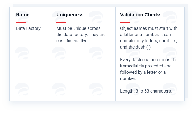 3. Consider standard naming conventions: It is vital to recognize the significance of effective naming conventions for any resource. When using naming conventions, you must know which characters are acceptable. Microsoft has established certain naming conventions for the Azure Data Factory. Refer to the below picture.